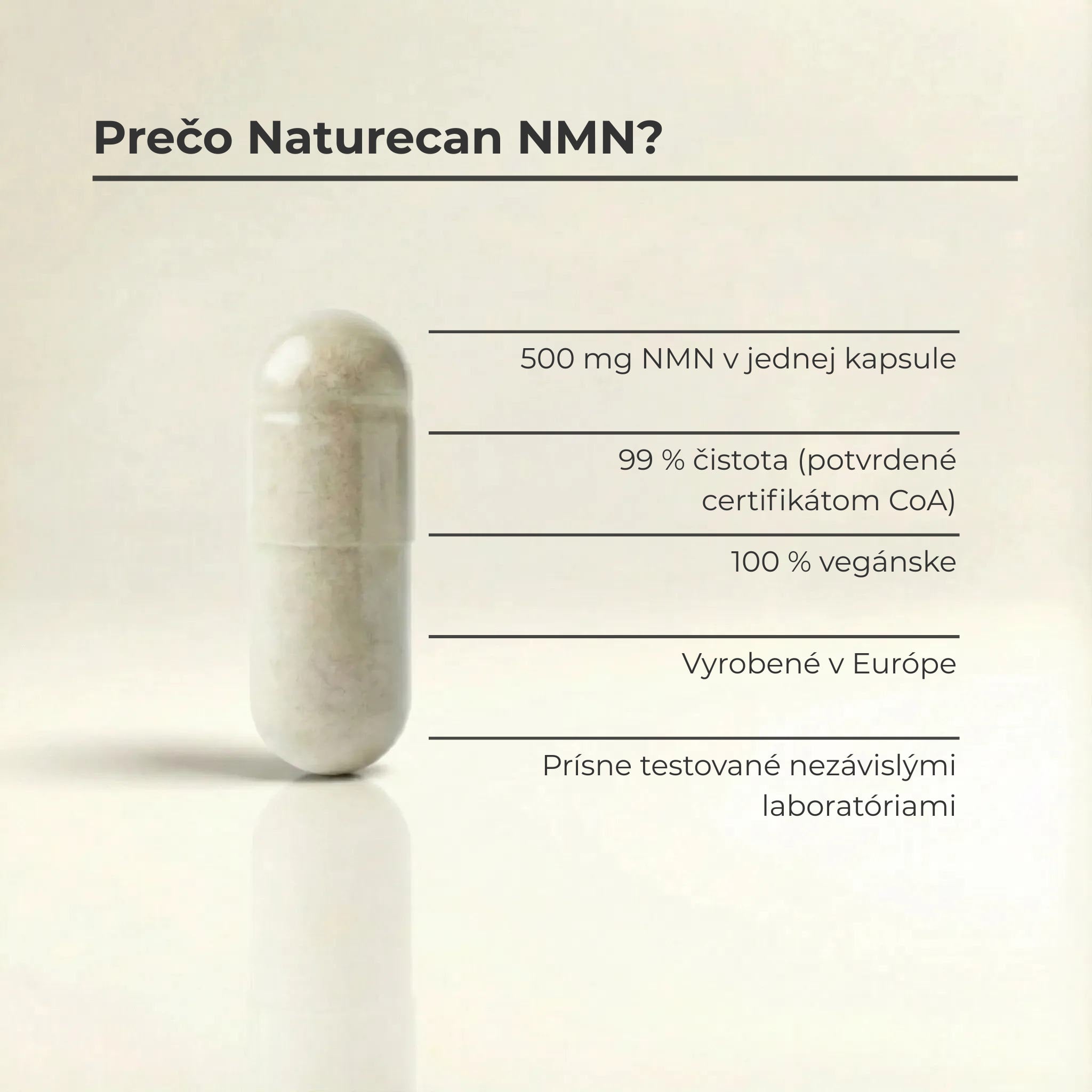 - 500 mg čistého NMN (nikotínamid mononukleotid) na kapsulu